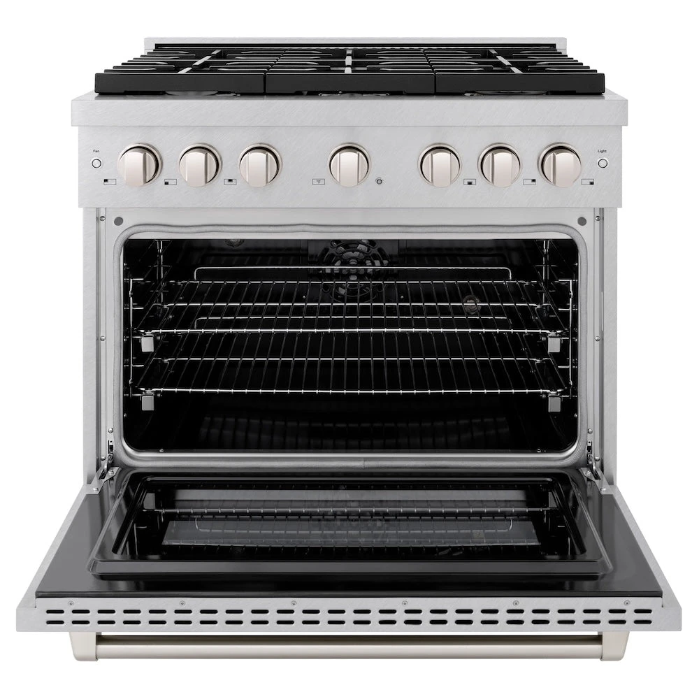 ZLINE 36 In. 5.2 Cu. Ft. Paramount Dual Fuel Range With Gas Cooktop And Electric Convection Oven In Satin Stainless Steel With 6 Brass Burners (SDRS-BR-36)(Zline 36 Paramount Dual Fuel Range Satin Stainless Steel Brass Burners Sdrs Br 36)
