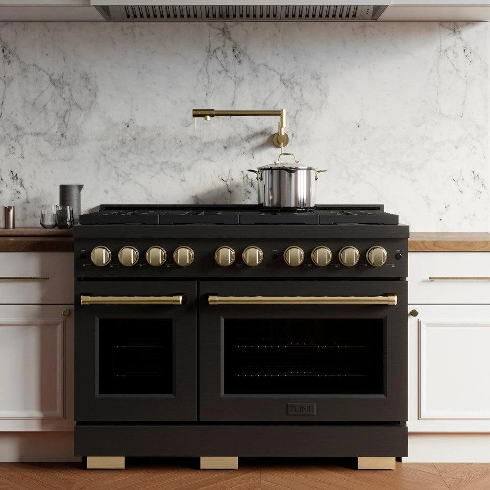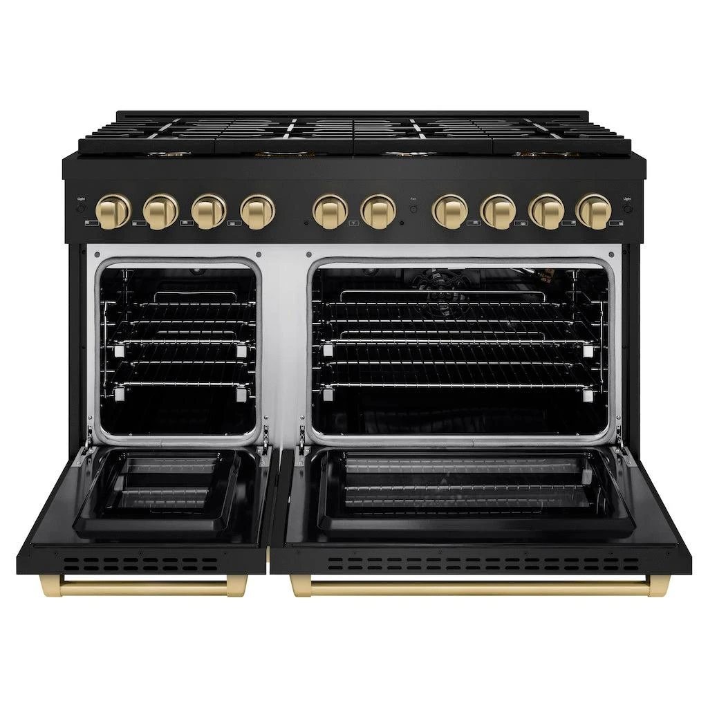 ZLINE Autograph Edition 48 In. 6.7 Cu. Ft. Paramount Double Oven Gas Range With 8 Burner Cooktop In Black Stainless Steel And Champagne Bronze Accents (SGRBZ-48-CB)(Zline Autograph Edition 48 Paramount Gas Range Black Stainless Steel Champagne Bronze Sgrbz 48 Cb)