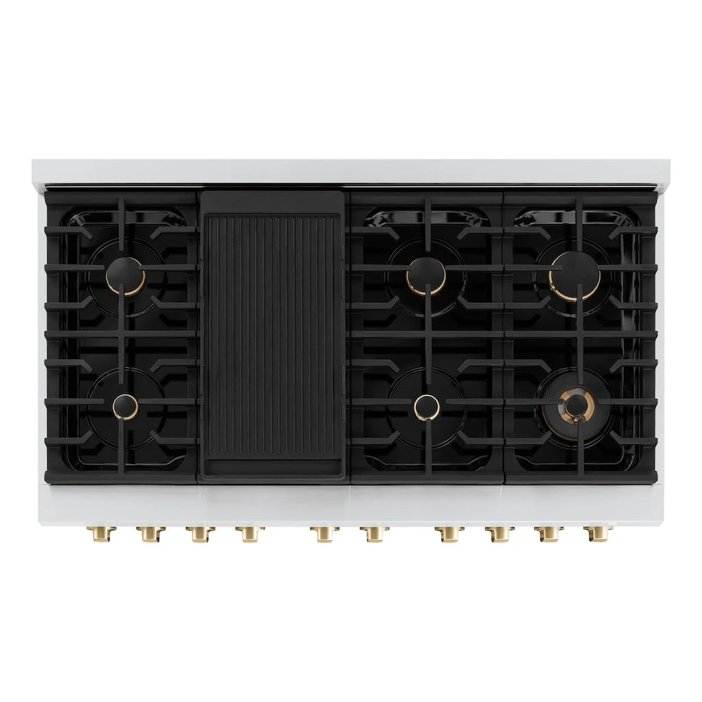 ZLINE Autograph Edition 48 In. 6.7 Cu. Ft. Paramount Double Oven Gas Range With 8 Burner Cooktop In Stainless Steel And Polished Gold Accents (SGRZ-48-G)(Zline Autograph Edition 48 Paramount Gas Range Stainless Steel Polished Gold Sgrz 48 G)